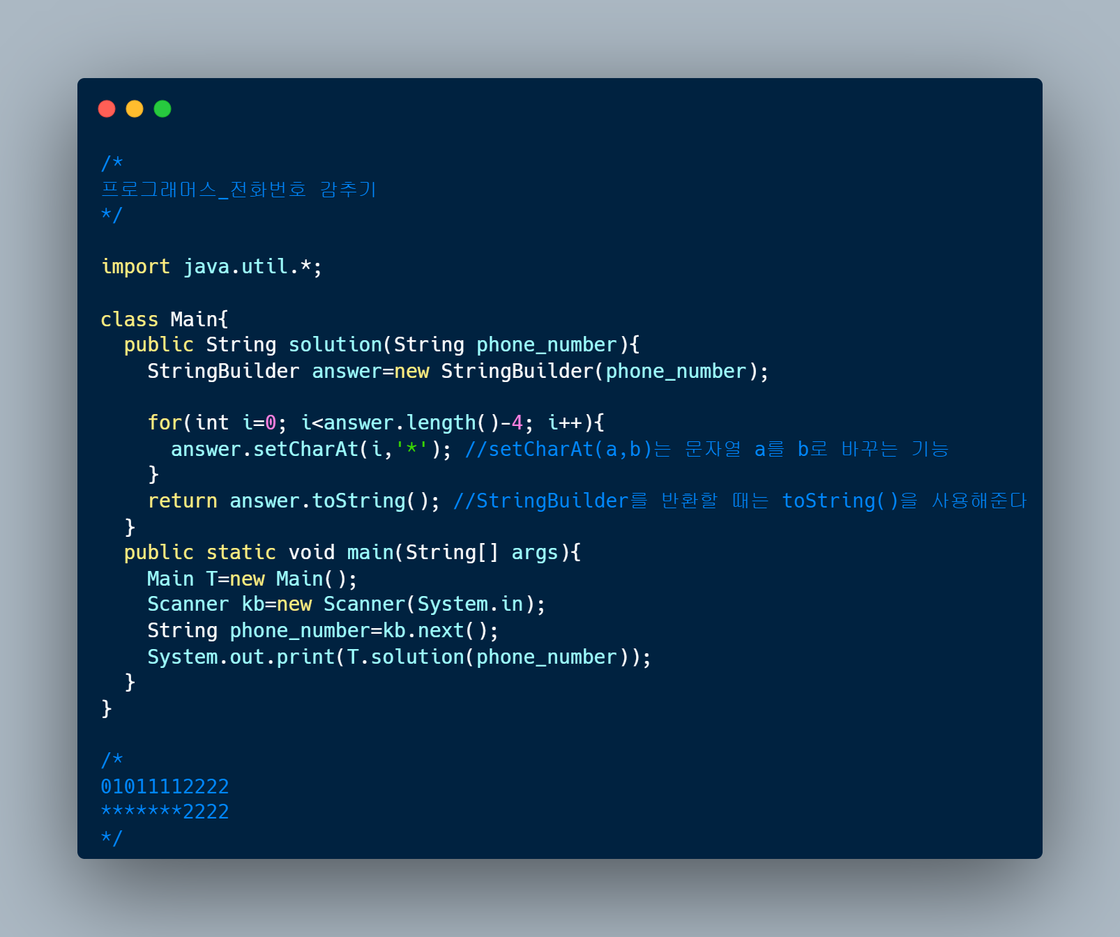 | 프로그래머스_핸드폰 번호 가리기 (0) | 2022.09.21 |